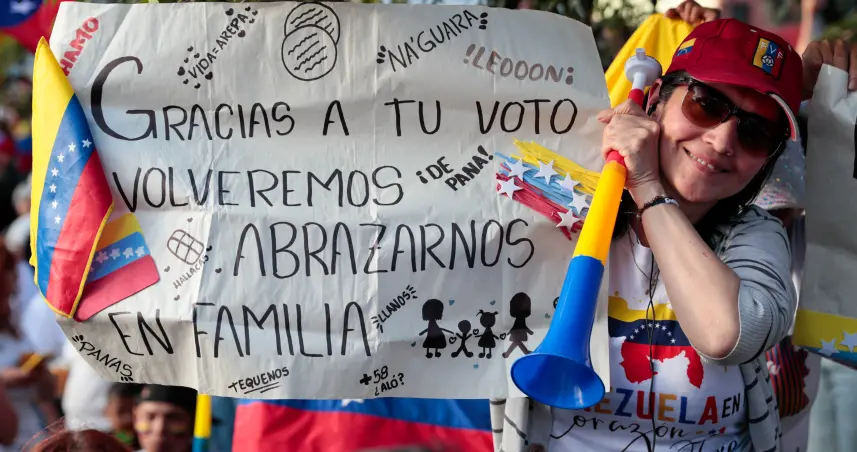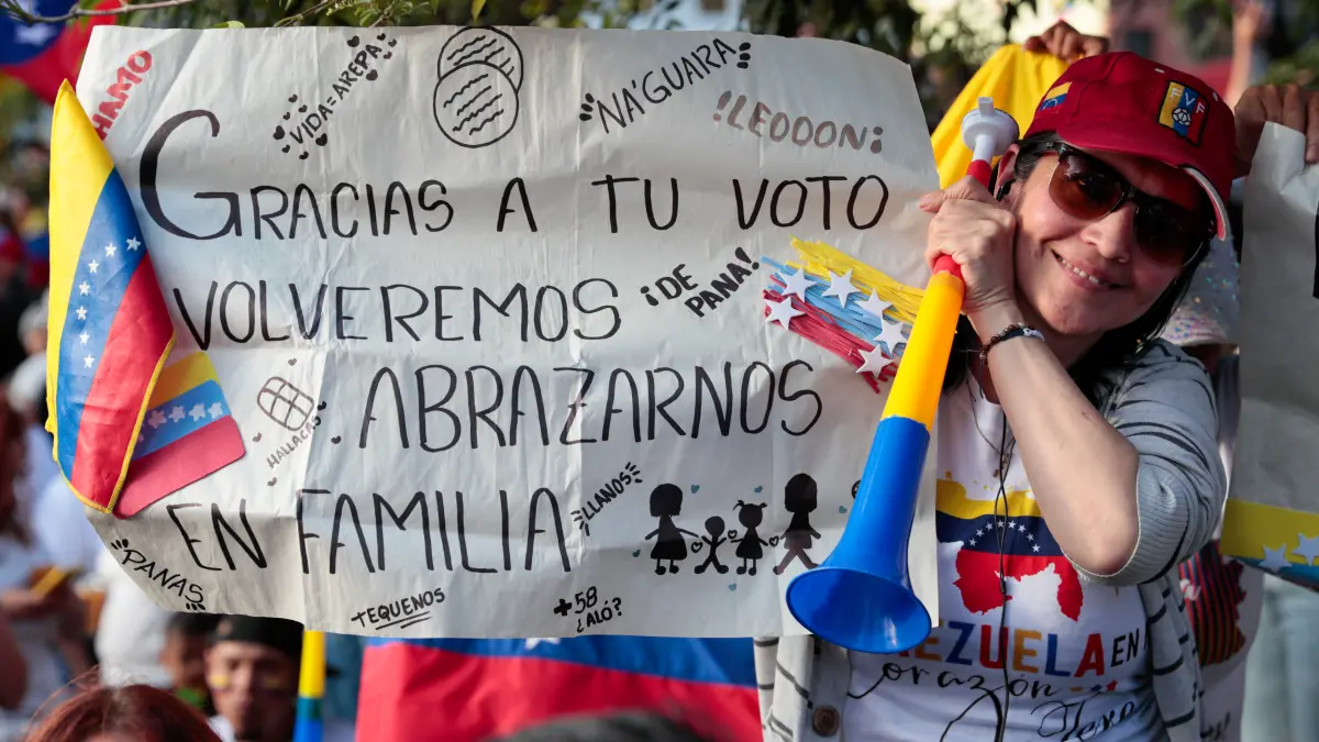 Al grito de "libertad, libertad", los manifestantes, vestidos con camisetas blancas o con la vinotinto de la selección de fútbol, agitaban banderas venezolanas y pancartas y hacían sonar cornetas como muestra de alegría por lo que las encuestas vaticinan que será una victoria del exembajador Edmundo González Urrutia, candidato de la coalición opositora Plataforma Unitaria Democrática (PUD).
