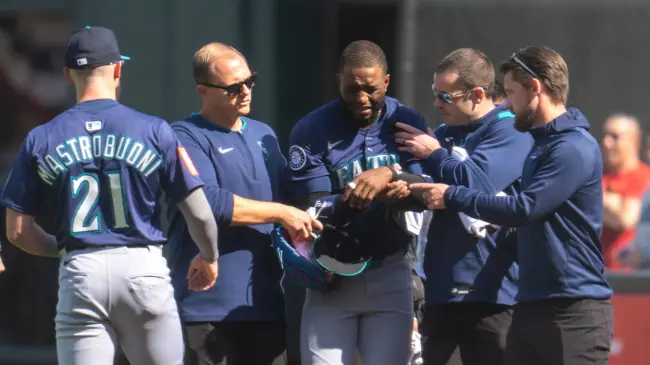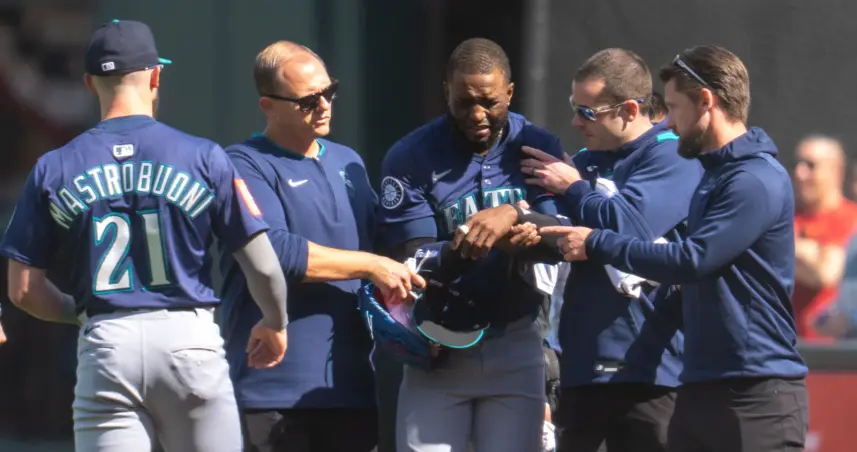 El jardinero de Seattle expresó un dolor extremo mientras lo sacaban en carrito, sujetándose el brazo izquierdo y haciendo una mueca de dolor mientras era ayudado por sus compañeros.