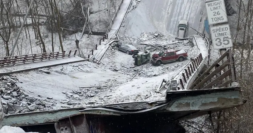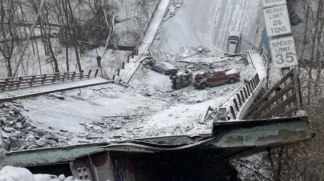 Una foto de la estación KDKA-TV de televisión local muestra al menos cuatro vehículos caídos en la brecha abierta por el desplome del puente y otro colgado de un borde.