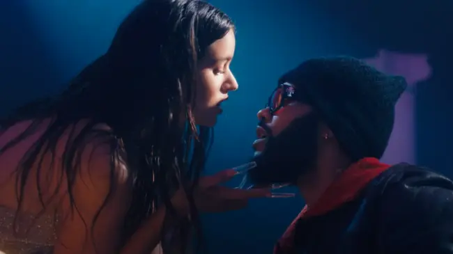 En "La Fama", Rosalía canta y baila con un traje de flecos de color perla sobre una base de bachata mientras desciende por las escaleras de una especie de cabaret y se acerca sensualmente hasta The Weeknd, quien se encuentra entre el público.