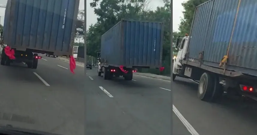 SANTO DOMINGO.- Casi en el aire iba un contenedor al ser trasladado en una camioneta, arriesgando la vida no solo del chofer sino también de los conductores que transitaban por la vía pública.
