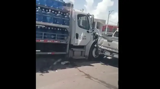 De acuerdo a un audiovisual el cual muestra como en horas de la tarde un camión de agua impactó por detrás a una camioneta que a su vez chocó un carro y este a otra camioneta.