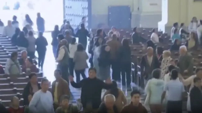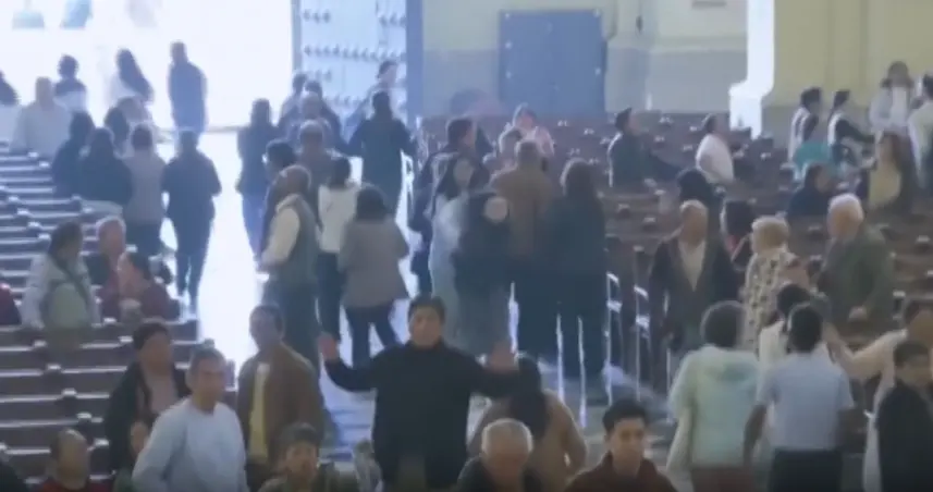 Ante el temblor, la gente salió corriendo del templo en busca de seguridad, dejando la ceremonia interrumpida y generando escenas de angustia.