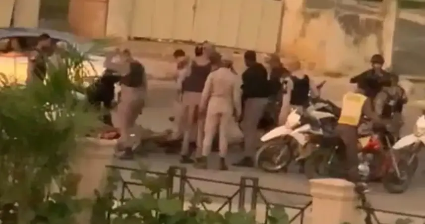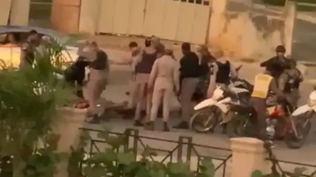 Luego de ser disparado por un policía, los demás miembros rodean el cuerpo, uno de ellos lo patea mientras otro descansa su pie sobre el occiso.
