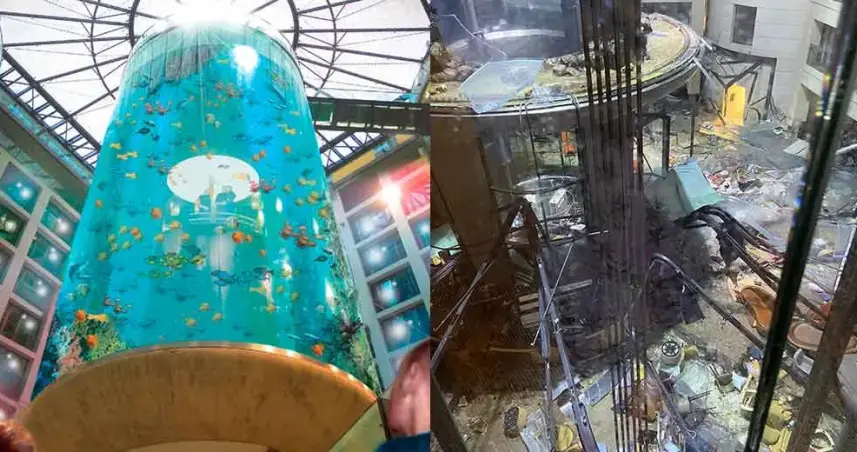 Berlín.- El AquaDom, el acuario cilíndrico más grande del mundo y ubicado en el hotel Radisson Collection de Berlín, reventó esta mañana aparentemente por deterioro del material y derramó un millón de litros de agua de su interior, además de 1.500 peces tropicales.