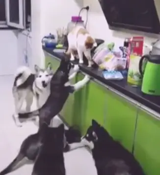 REDACCIÓN.- Se hace viral este video en el que se puede observar a una gata alimentando a cinco perros en una cocina.