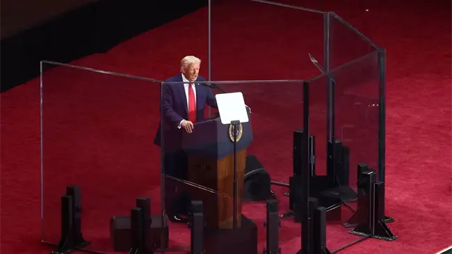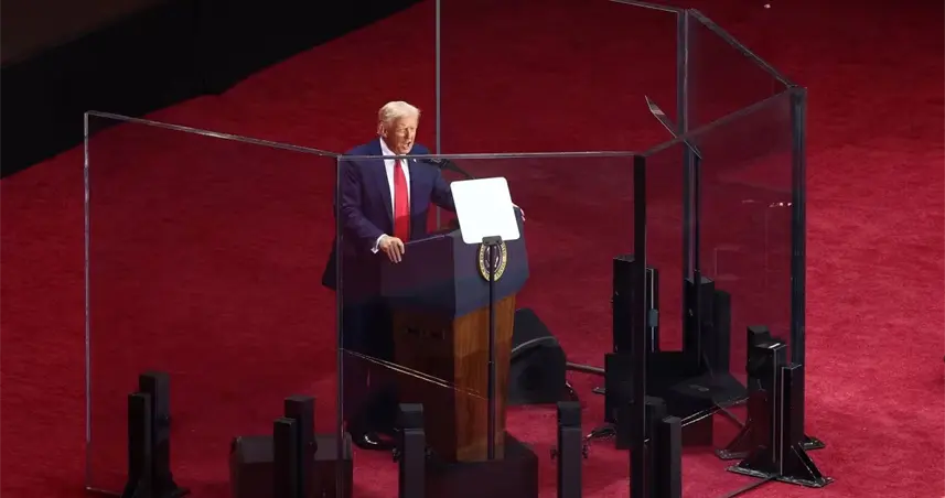 El podio asegurado con vidrio, ubicado al frente y al centro, refleja las medidas de seguridad que ahora son estándar en eventos grandes y en espacios abiertos que incluyen al presidente, especialmente después del intento de asesinato de Trump el año pasado en Butler, Pensilvania.