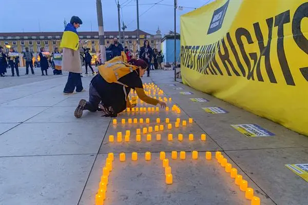 Según pudo constatar EFE, a este acto acudieron portugueses, extranjeros y algún que otro ucraniano, que se colocaron en silencio en un semicírculo alrededor de un gran póster de la organización Amnistía Internacional (AI), que decía "protejan los derechos humanos", con unas velas delante que formaban en el suelo la palabra Ucrania.