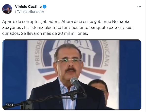 "Aparte de corrupto, jablador. Ahora dice en su gobierno no habían apagones, cuando el sistema eléctrico fue suculento banquete para el y sus cuñados. Se llevaron más de 20 mil millones", sentenció Castillo en un mensaje en sus redes sociales.