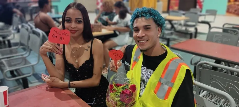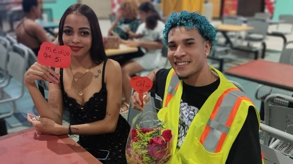 “Yeisi MR” nombre por el que también es conocida Yesica, y quien en su tiempo libre se dedica a cantar música urbana, llegó la noche de este jueves a al centro comercial con flores rojas, un anillo de compromiso y con una pancarta que rezaba: “¿Te quieres casar conmigo?”, lo que causó gran asombro de todos los presentes.