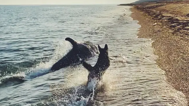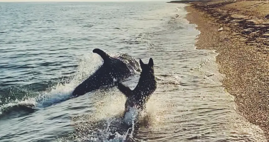 Viral el video de un perro y un delfín jugando en la playa
