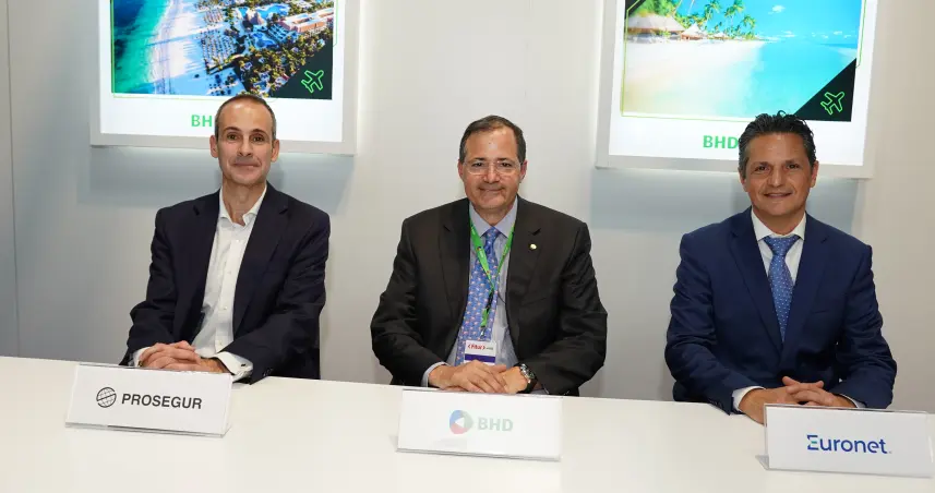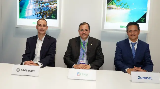 El acuerdo fue logrado en el marco de FITUR 2024 por Steven Puig, presidente del Banco BHD; Gabriel Glasberg, ATM Network Development Director de Euronet, e Ignacio Cea, New Businesses Global Managing Director de Prosegur Cash.