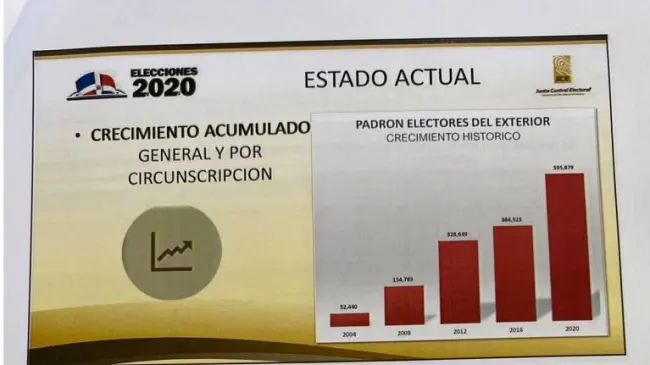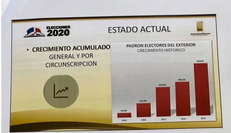 Según los datos suministrados por la JCE, el crecimiento neto entre periodos electorales reflejó que la actual gestión 2016-2020 es en la que se ha tenido un mayor aumento de empadronamiento en el exterior. En el periodo 2004 y 2008 el incremento fue de 102,358 empadronados; entre los años 2008 y 2012 fue de 173,860 empadronados; y en el periodo 2012 y 2016 se observó un incremento de 55,874 empadronados.