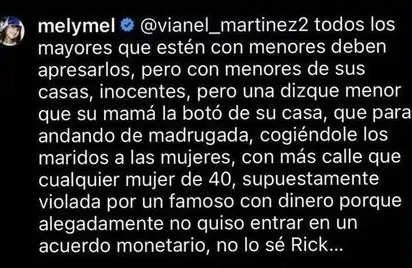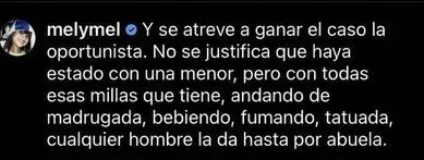 "Y se atreve a ganar el caso la oportunista. No se justifica que haya estado con una menor. Pero con todas esas millas que tiene, andando de madrugada, bebiendo, fumando, tatuada, cualquier hombre la da hasta por abuela", expresó Melymel en los comentarios,