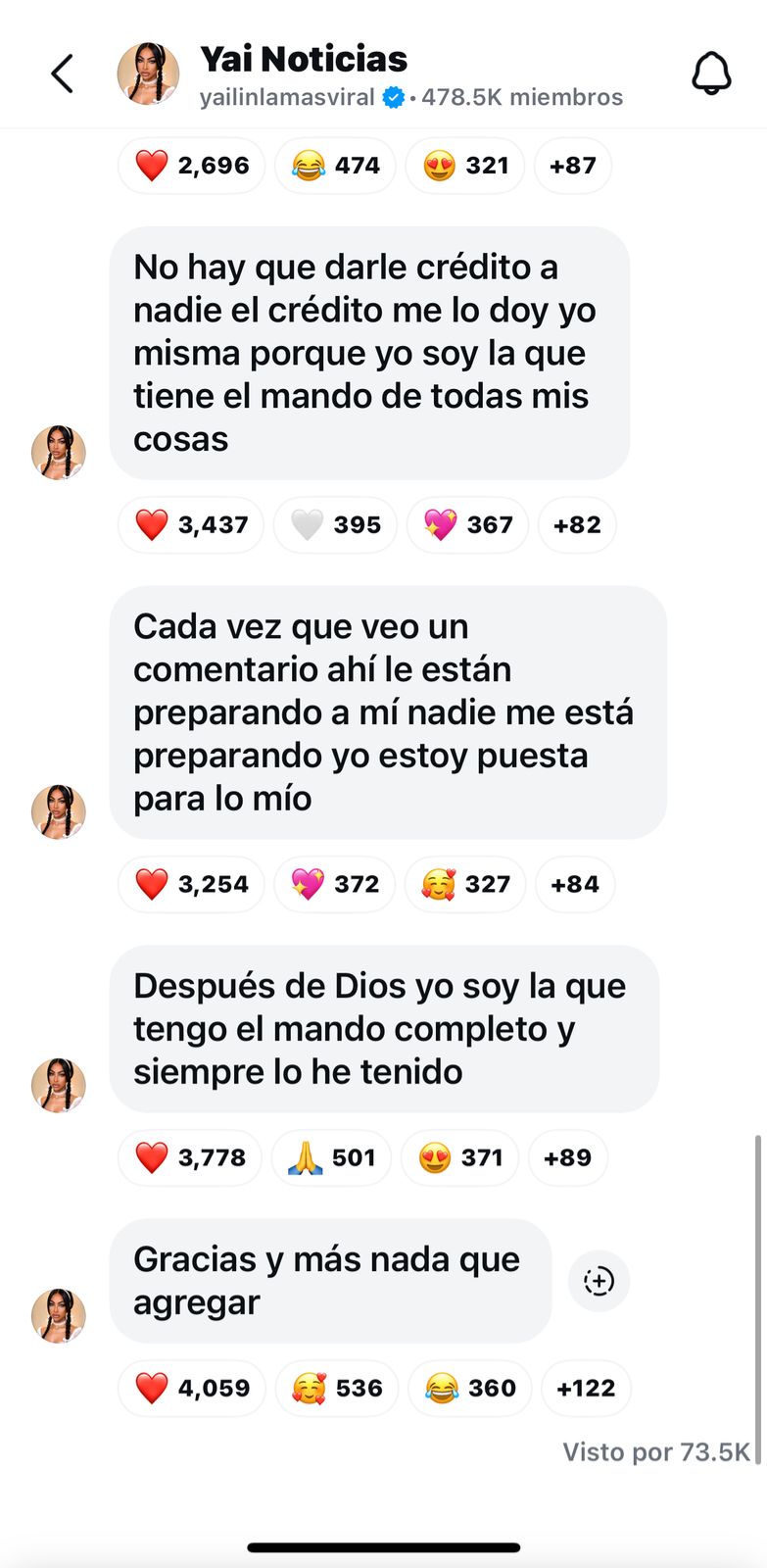"Después de Dios, yo soy la que tengo el mando completo y siempre lo he tenido", culmino su mensaje para sus más de 478,5 mil seguidores en su canal de difusión de su Instagram.
