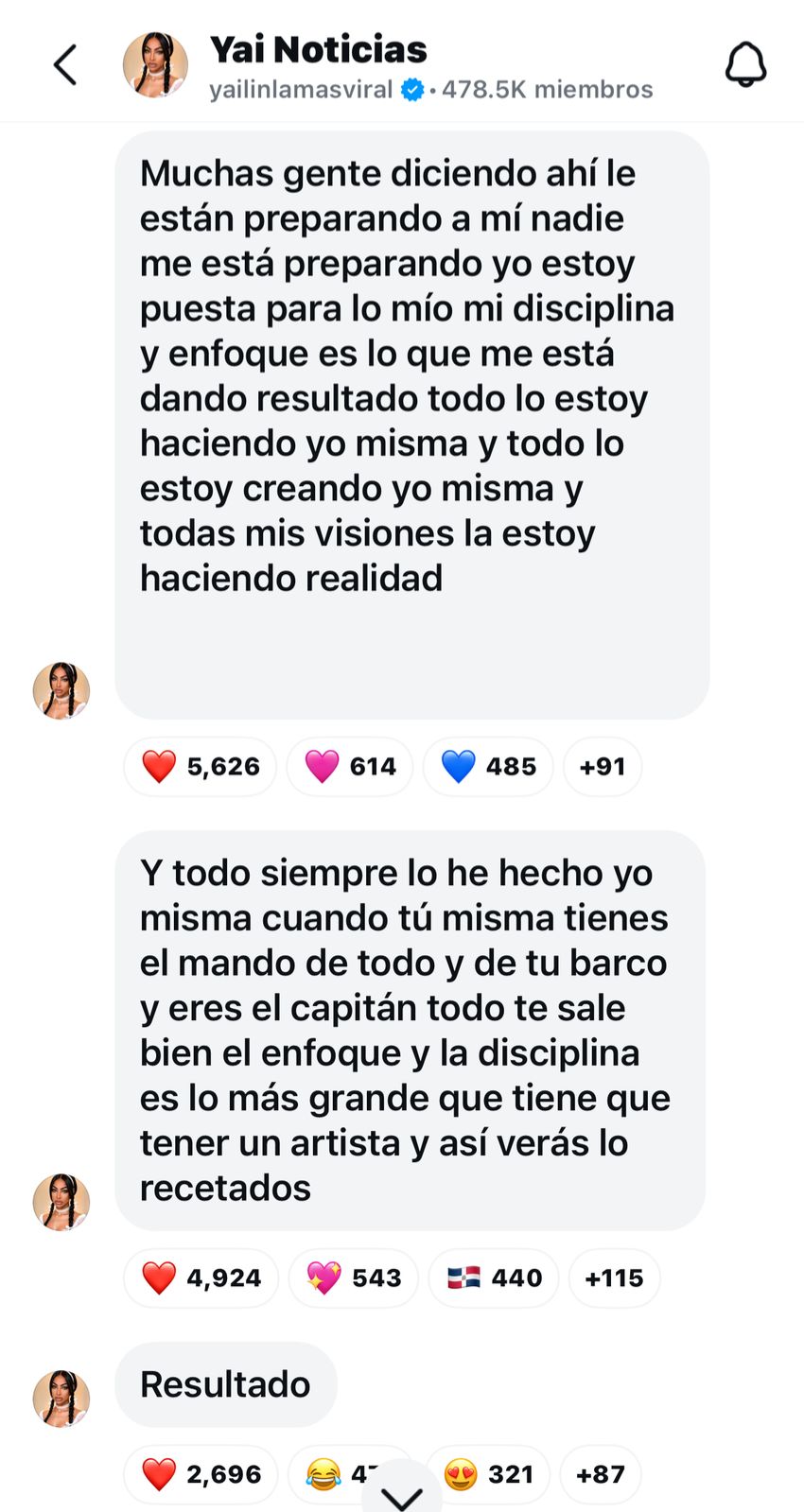 "A mi nadie me está preparando, yo estoy puesta para lo mío. Mi disciplina y enfoque es lo que está dando resultado, todo lo estoy haciendo yo misma y todo lo que estoy creando yo misma, todas mis visiones la estoy haciendo realidad", aseguró Yailin La Más Viral.