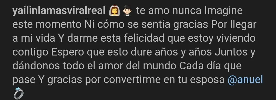«Te amo. Nunca Imagine este momento ni cómo se sentía. Gracias por llegar a mi vida y darme esta felicidad que estoy viviendo contigo. Espero que esto dure años y años Juntos y dándonos todo el amor del mundo cada día que pase y gracias por convertirme en tu esposa» colocó la urbana dominicana Yailin junto a la publicación.