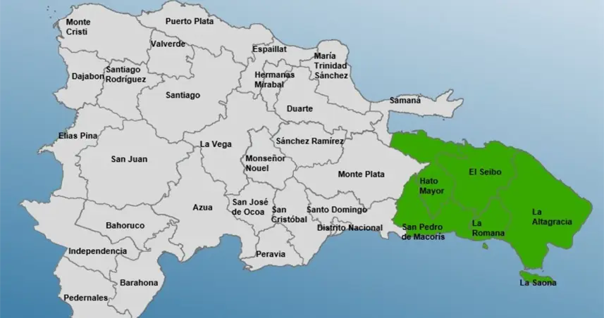 Las provincias bajo alerta verde son La Altagracia, La Romana, El Seibo, San Pedro de Macorís y Hato Mayor, ante el riesgo de crecidas de ríos, arroyos y cañadas, así como inundaciones repentinas o urbanas.