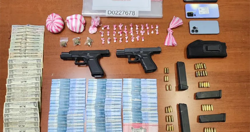 Durante la intervención, las autoridades ocuparon 322 gramos de presunta cocaína, 3.2 gramos de marihuana, dos pistolas Glock, 43 cápsulas 9 mm, cinco cargadores, RD$95,000 y US$337, entre otras evidencias.