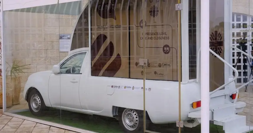 Además, está serigrafiado en sus laterales en inglés con su apodo -el "Vehículo de la esperanza"-, las palabras "clínica móvil" y el eslogan "Ponemos al amor en acción", asociado a Cáritas; así como los logos de esta entidad, del Patriarcado Latino de Jerusalén y de la Autoridad Nacional Palestina, que ha permitido la llegada del automóvil a Cisjordania.